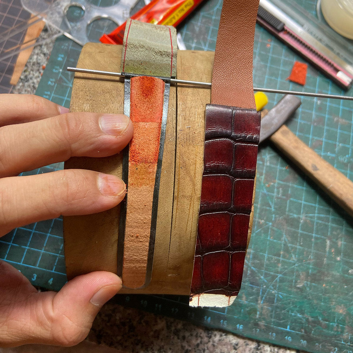 職人が手作業で製作を行います。革の裁断から縫製、縁塗りまで、すべて手作業で仕上げます。