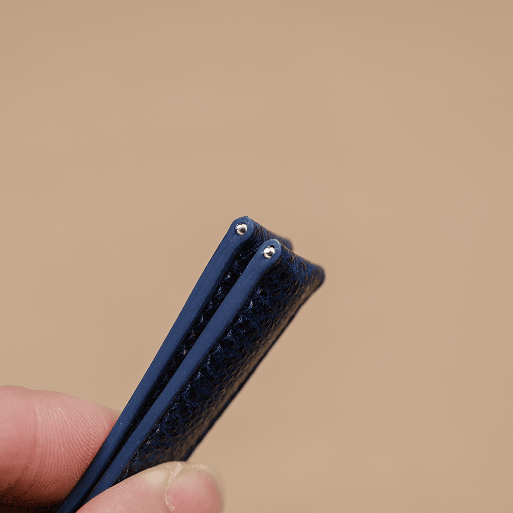 ツェルマット(フランス製)を使用し、カーフならではの繊細な肌触りと柔らかなタッチをそのまま活かしつつ、丁寧な撥水加工を施しております。これにより、防水性および耐アレルギー性を実現し、時計ベルトのライニングなど、直接肌に触れるデリケートなパーツに最適な裏材となっております。