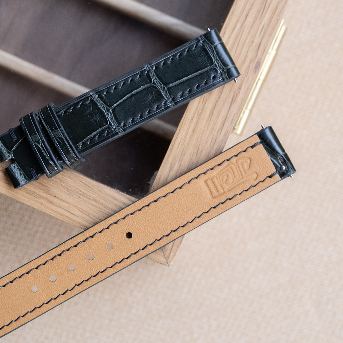 藍染め ヴィンテージブルー マホガニー ダークネイビー グリーン ダークフォレス クロコダイル アリゲーターワニ革 フラットタイプ 腕時計ベルト 凹凸型 カーブエンド (弓カン)