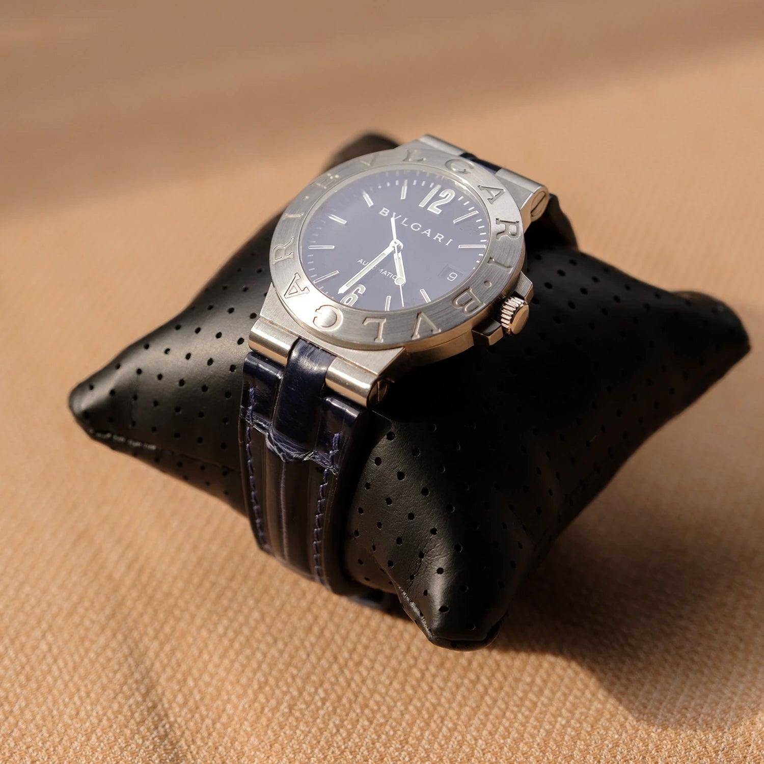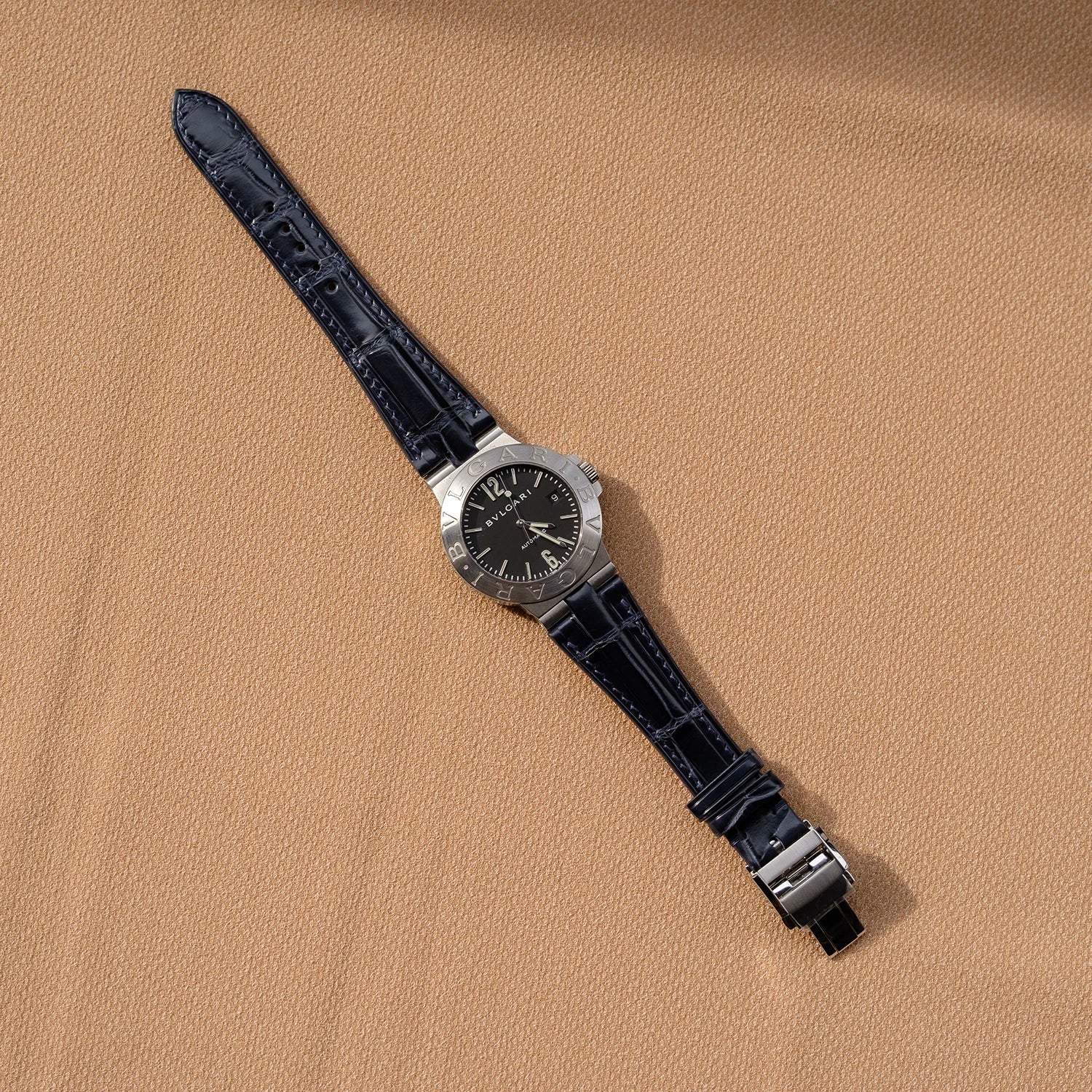 ブルガリ ディアゴノ専用の本革時計バンドは、職人の手によって丁寧に作られています。独自の肉厚加工を施し、ディアゴノ特有の洗練されたデザインと一体化することで、時計に高級感と調和をもたらします。耐久性に優れた天然皮革を使用し、長期間の使用でも快適さを保ちます。ブルガリ ディアゴノの魅力をさらに引き立てる、理想的なアクセサリーです。